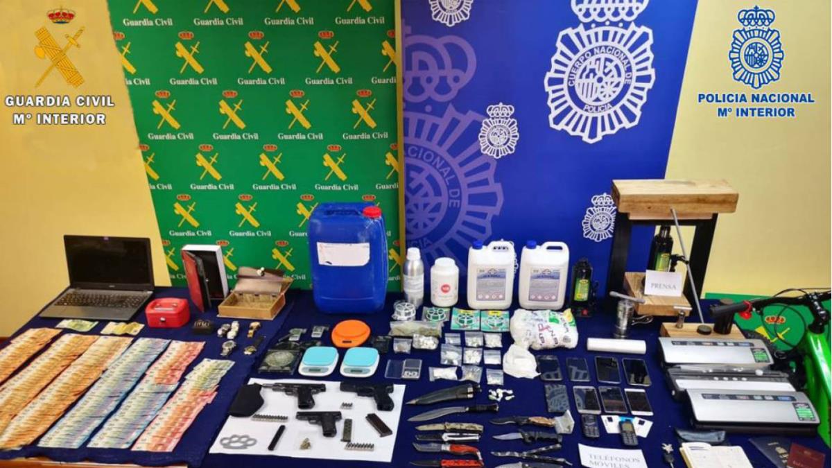 La investigación ha sido realizada conjuntamente por ambos Cuerpos y lleva desarrollándose desde hace varios meses. La Guardia Civil ha detenido tres mujeres y cuatro hombres y ha incautado dos pistolas, una de calibre 9mm y otra de 7,65 mm y también de una pistola de aire comprimido; 172 gramos de cocaína, de los que 40,5 estaban listos para ser distribuidos en un total de 58 dosis, 25 gramos de marihuana, 1.000 gramos de cafeína, sustancia utilizada para el corte de cocaína, un puño americano, una navaja mariposa y un puñal, todas ellas armas prohibidas.