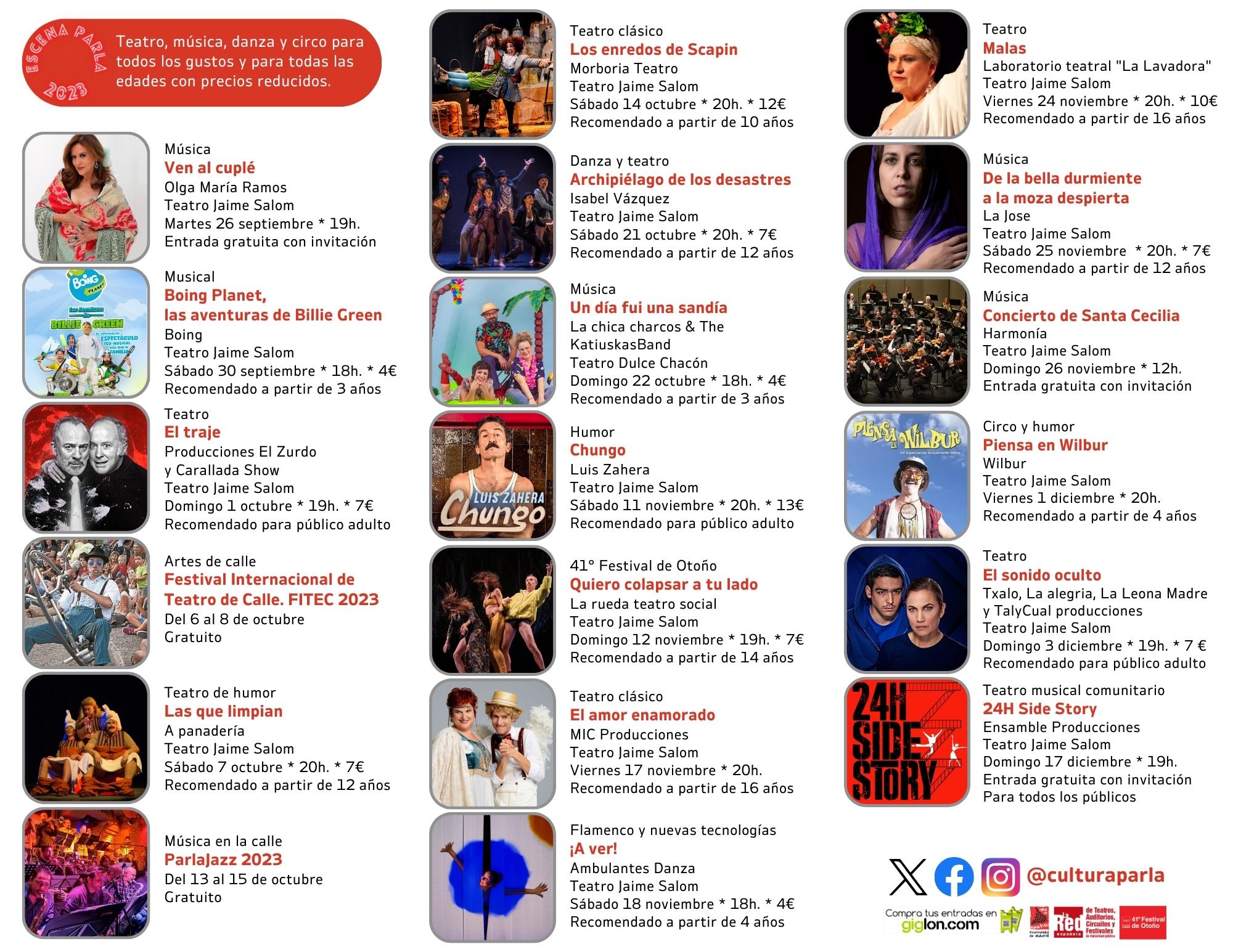 El Ayuntamiento de Parla ha puesto a disposición de todos los vecinos la programación completa que podremos disfrutar hasta final de año en Escena Parla. Un cartel completísimo con rostros tan conocidos como Luis Zahera (con ell espectáculo cómico Chungo), Javier Gutiérrez (con la obra El traje) o Toni Acosta (con la obra El sonido oculto).