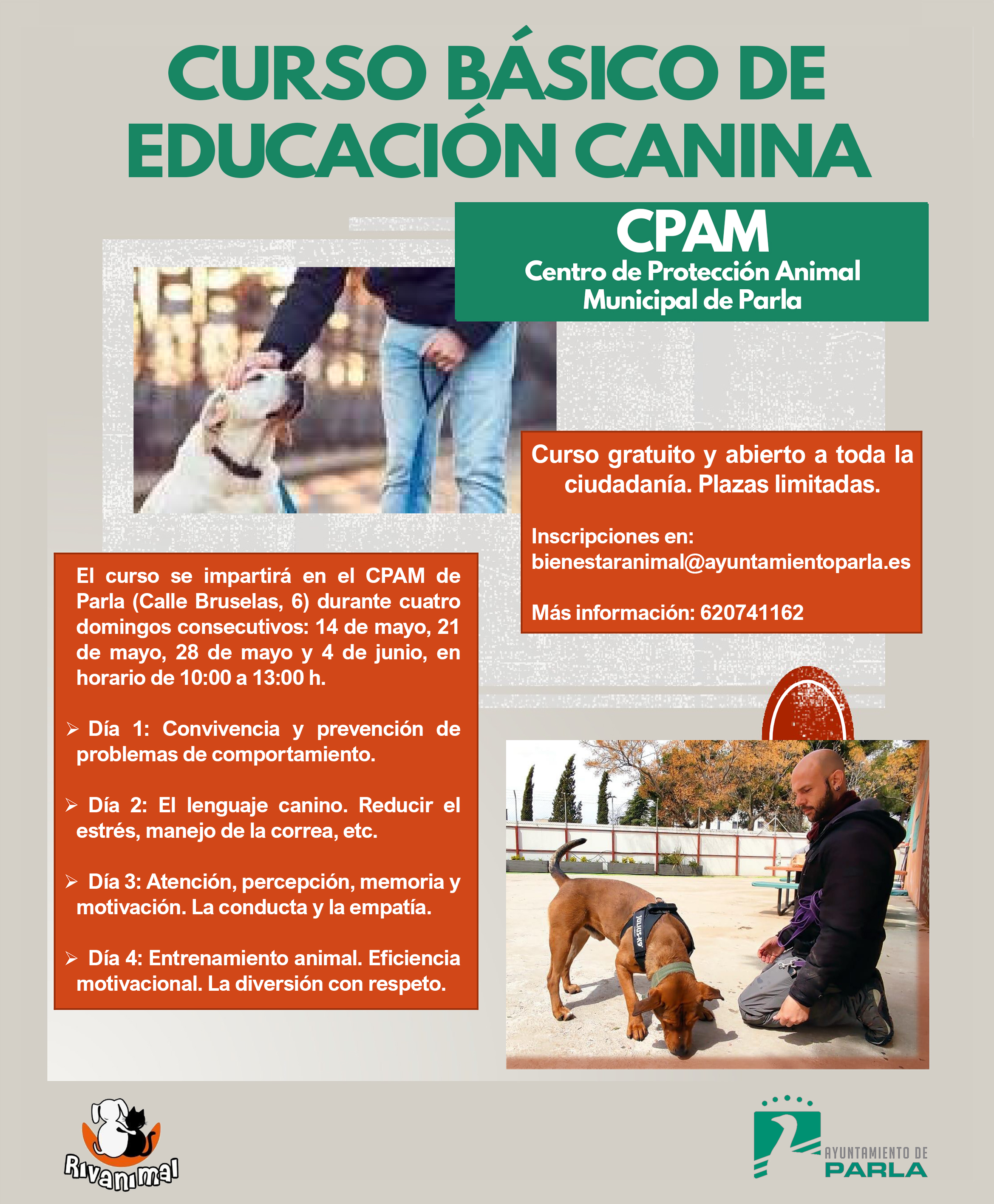 El Ayuntamiento de Parla, a través de Concejalía de Bienestar Animal, ha preparado unas jornadas gratuitas de educación canina básica para todas aquellas personas interesadas en el adiestramiento de una mascota. El curso se desarrolla durante 4 domingos consecutivos a partir del 14 de mayo en el Centro de Protección Animal ubicado en la Calle Bruselas 6 de 10:00 a 13:30 horas.