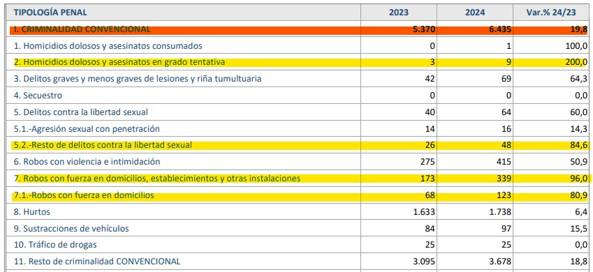 Según se puede comprobar en el informe compartido en abierto por el Ministerio, los casos en los que vemos una tendencia a la alza se corresponden con homicidios dolosos y asesinatos en grado de tentativa que aumentan un 200%, robos con fuerza en domicilios, establecimientos y otras instalaciones en un 96%; por último, delitos contra la libertad sexual que experimentan una subida del 84,6%, pasando de 26 casos en 2023 a 48 durante el año pasado.