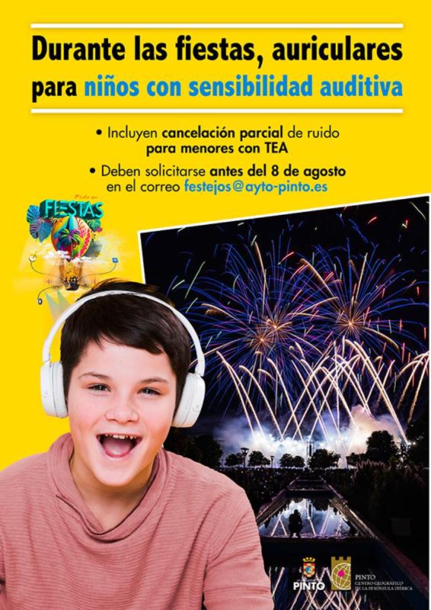 El Ayuntamiento de Pinto se compromete con la inclusión de todos los vecinos en los eventos festivos pinteños y, como muestra de ello, ha anunciado que proporcionará auriculares con cancelación de ruido ambiente a todos aquellos menores con sensibilidad auditiva (causada por el TEA) de cara al disfrute de las fiestas patronales, que se celebran en el municipio del 9 al 15 de agosto.