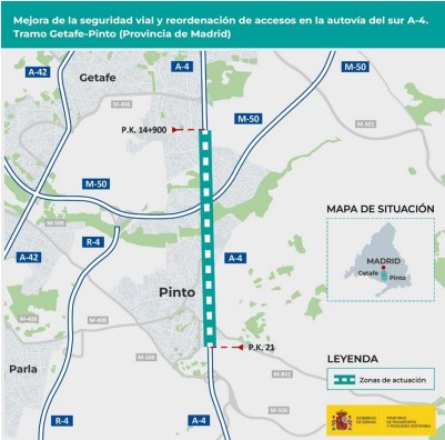 El Ministerio de Transportes y Movilidad Sostenible ha licitado por 2,8 millones de euros (IVA incluido) la redacción del proyecto de trazado y construcción para la mejora de la seguridad vial y reordenación de accesos en la autovía del Sur A-4, en el tramo entre el polígono industrial Los Molinos de Getafe y el enlace M-841 en Pinto, en la Comunidad de Madrid. El anuncio correspondiente será próximamente publicado en el Boletín Oficial del Estado.
