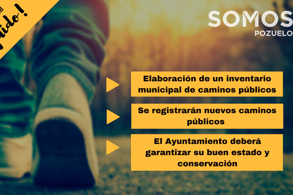 Se aprueba en el Pleno la moción de Somos Pozuelo para la recuperación y protección de los caminos públicos del municipio.  Se elaborará un inventario que garantizará el reconocimiento de dichos caminos como patrimonio publico de Pozuelo, esto implica que las administraciones deberán preservarlos, protegerlos y conservarlos.