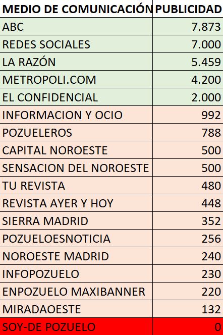 En lo que a nuestro medio respecta, como se puede comprobar en la tabla facilitada anteriormente, no se ha recibido nada por ningún tipo de publicidad. Pero esto no es lo único, como siempre damos a entender en nuestras informaciones, este medio intenta ponerse en contacto con el Ayuntamiento de Pozuelo de Alarcón para que nos puedan dar sus versiones, pero nunca llega una respuesta.