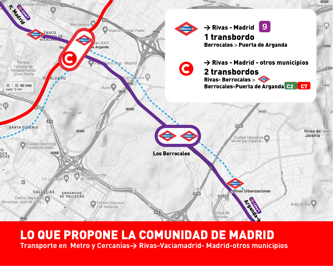 El nuevo transbordo, forzado por este proyecto del Gobierno regional, supondría un grave perjuicio para las vecinas y los vecinos de Rivas que usan esta línea de Metro, tanto en el tiempo empleado en sus viajes como en los recursos económicos que tengan que destinar a ellos. Hay que recordar que Rivas es el único municipio de su tamaño en la Comunidad de Madrid que no cuenta con estación de Cercanías.