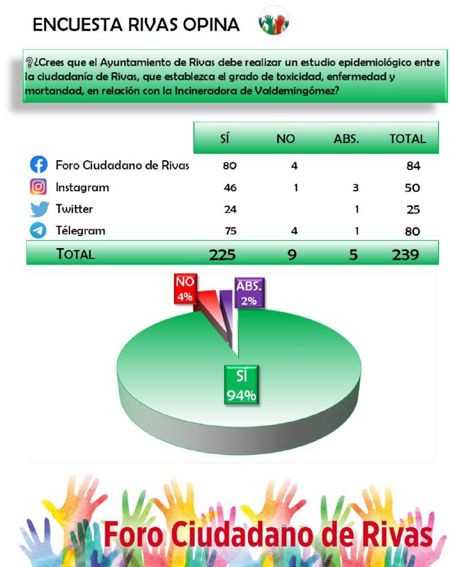 Rivas Opina saca a la luz una de sus nuevas encuestas en las que se lanzaba la siguiente pregunta a los vecinos: "¿Crees que el Ayuntamiento de Rivas debe realizar un estudio epidemiológico entre la ciudadanía que establezca el grado de toxicidad, enfermedad y mortandad, en relación con la Incineradora de Valdemingómez?".