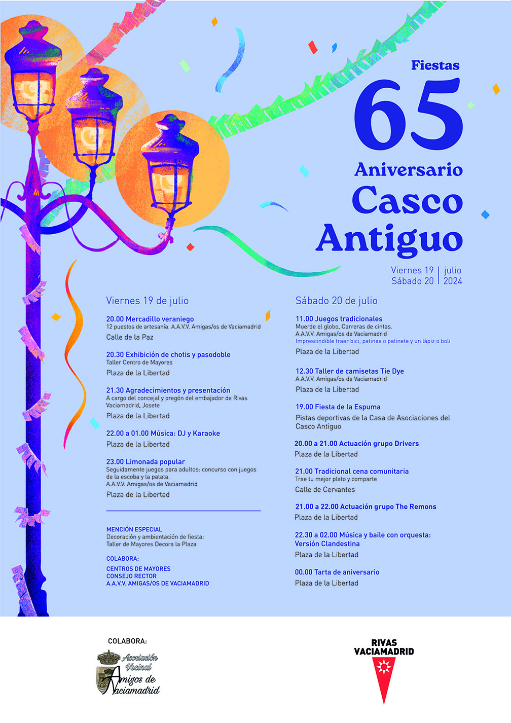 Colaboran para hacer posibles estas fiestas de aniversario: la Asociación Vecinal Amigos de Vaciamadrid, los centros municipales de mayores y el Consejo Rector de Mayores.