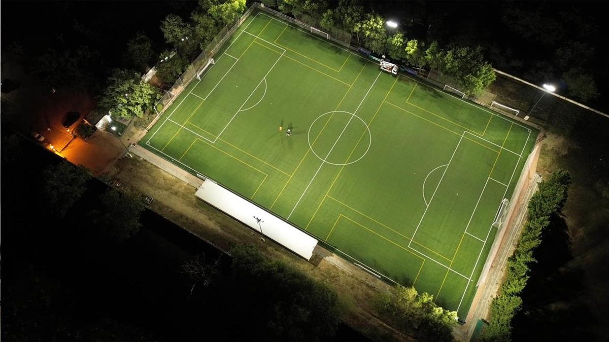 Para conseguir la mejor orientación de los focos sobre el terreno de juego y obtener un mayor rendimiento lumínico, se ha utilizado un dron que ha permitido a los técnicos visualizar el campo de fútbol en su conjunto.