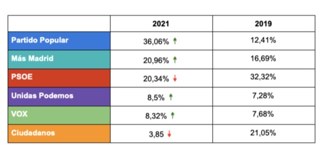 Al final de la jornada, se consiguió una participación total del 78,37%; esto se traduce en un 8,32% más de votantes que en 2019 (70,05%). Finalmente, pasada la media noche se logró escrutar el grueso de los votos y el PP se hizo con la victoria en otro municipio madrileño más. Tras el recuento los votos quedaron así: