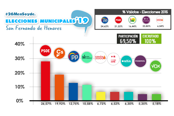 Con los últimos datos escrutados, a las 15:21 horas, en nuestra municipio, San Fernando de Henares, se registraba una participación del 69,50% -0,16 puntos más que las cotas alcanzadas en las elecciones municipales del año 2015- y un total de 20.093 votos contabilizados.