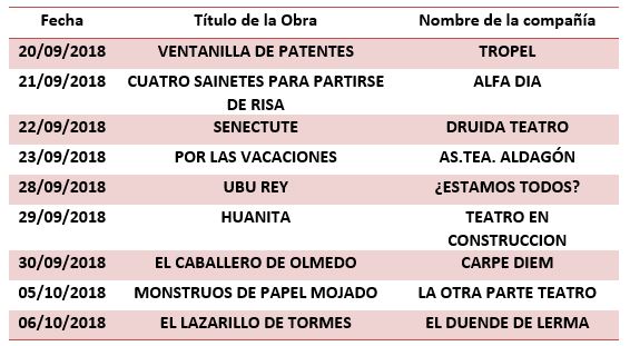 De estas obras podemos encontrar desde comedia hasta drama, incluyendo algún título clásico como "El duende de Lerma". Aparte de las tres compañías sanfernandinas se suman otras de Alcobendas, Paredes de la Nava (Palencia), Elche, Tomelloso y Fuenlabrada.