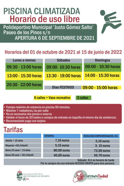 El Ayuntamiento de San Fernando de Henares, a través de la Concejalía de Deportes, informa sobre nuevos horarios en la piscina cubierta climatizada para su uso libre debido al inicio de los cursos de natación. Estará en vigor desde el día 01 de octubre hasta el próximo 15 de junio.