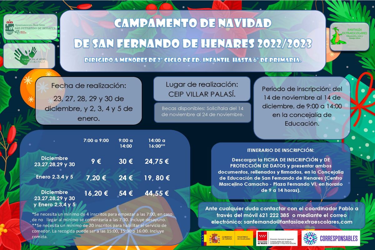 El Ayuntamiento de San Fernando de Henares, a través de la Concejalía de Educación que dirige Guadalupe Piñas, pone en marcha una nueva edición del Campamento Urbano de Navidad. El plazo de inscripción dará comienzo el próximo 14 de noviembre y se prolongará hasta el 14 de diciembre. También existe la posibilidad de pedir beca y, en este caso, las solicitudes deberán presentarse entre el 14 y 24 de noviembre.