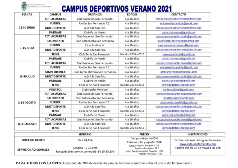 Destacar, asimismo, que el plazo de inscripción se abrirá el día 26 de mayo, a partir de las 12 horas, a través de la página web del Ayuntamiento de San Fernando de Henares.