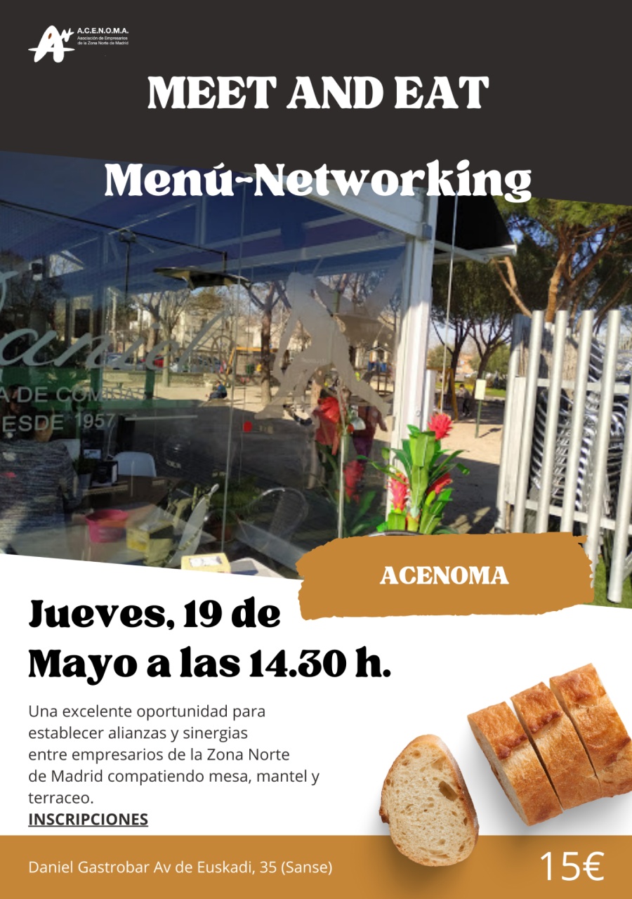 ACENOMA reúne a empresarios de la zona norte de Madrid con el objetivo de crear alianzas y sinergias. El evento se celebrará el próximo 19 de mayo a las 14:30 horas en el restaurante Daniel Gastrobar (AV. Euskadi,15).
