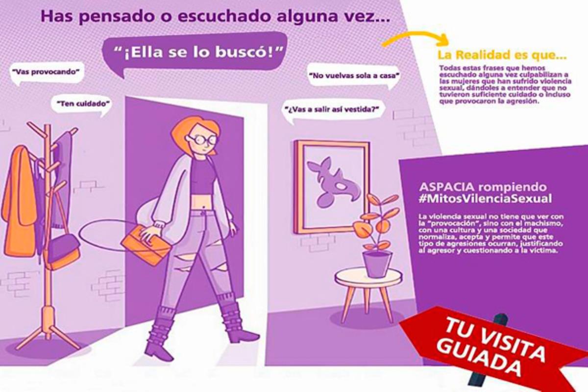 Cada panel está ilustrado y acompañado de varias frases de uso cotidiano que cuestionan la violencia sexual, acompañadas de una reflexión sobre lo que en realidad se piensa y con información que permite desmontar y romper esos mitos que todas y todos tenemos en torno a la violencia sexual. Se ofrece la posibilidad de hacer visitas guiadas con talleres participativos a los grupos que lo soliciten a la Delegación de Igualdad.