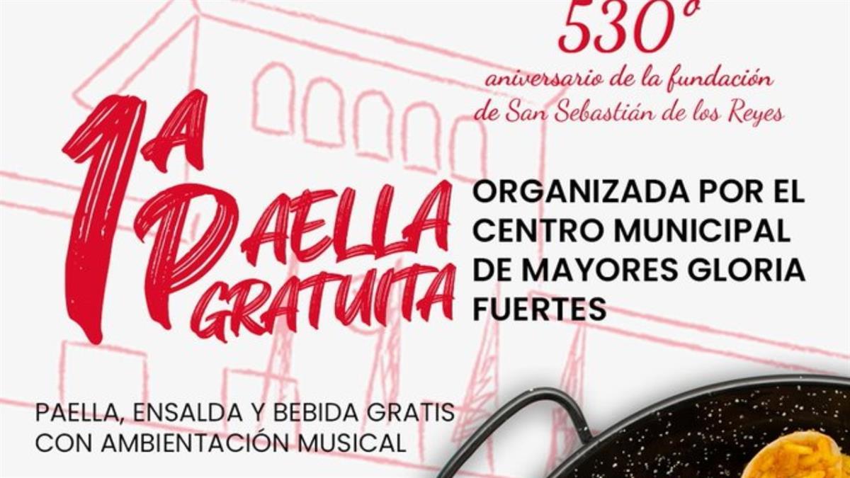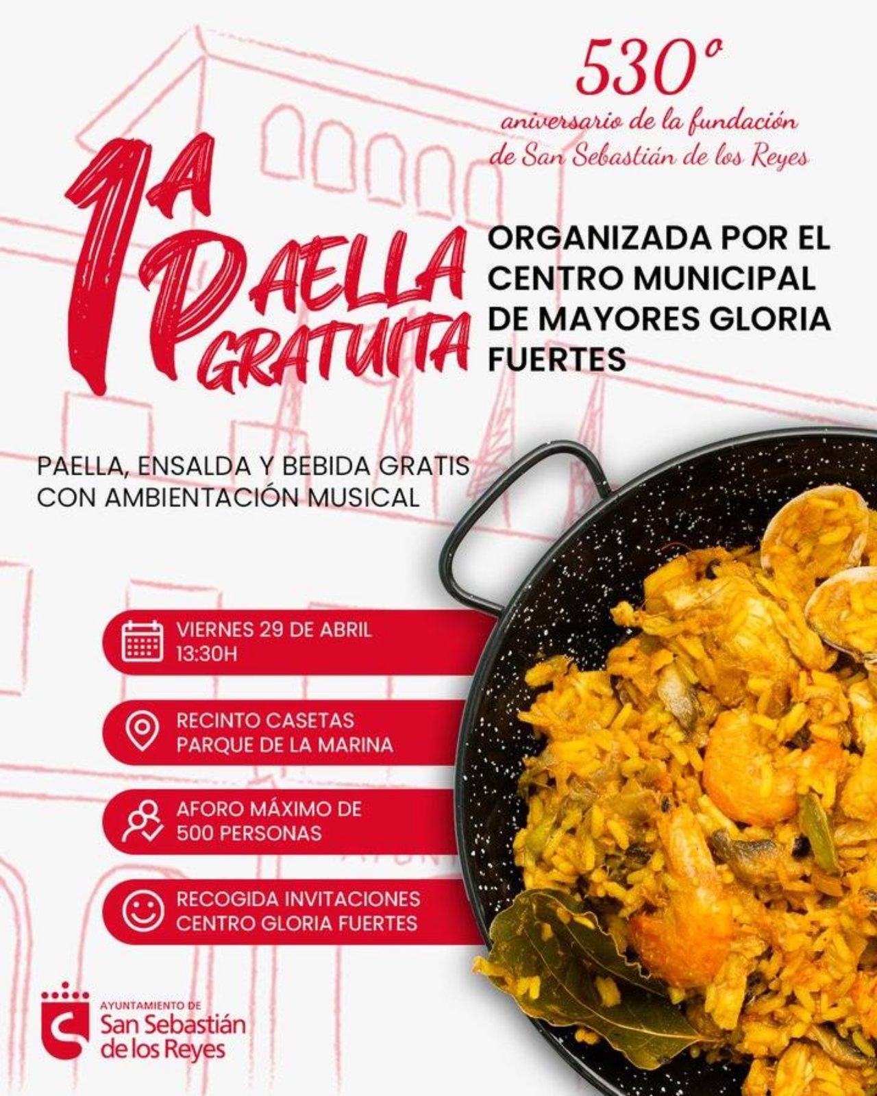 El viernes 29 de abril a las 13:30 horas el Centro de Mayores Gloria Fuertes invita a los mayores del municipio de Sanse a la "Primera Paella Gratuita". Con motivo de la celebración del 2 de mayo, día del 530º Aniversario de la fundación de San Sebastián de los Reyes.El evento tendrá lugar en el recinto de casetas del parque de La Marina.