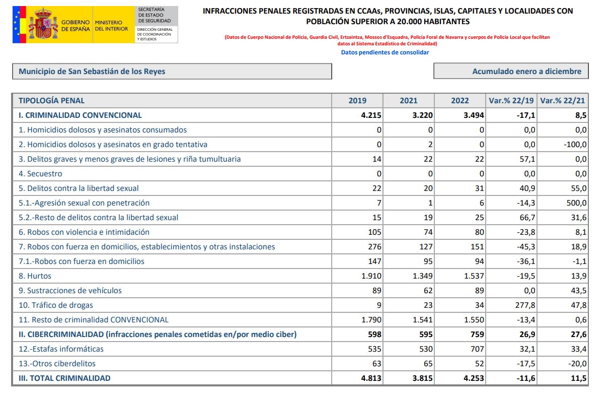 Estos datos son negativos comparados con 2021, pero en esta categoría se refleja una disminución considerable respecto a 2019, donde todos los datos, incluso en los hurtos, son menores. Además, los robos con fuerza en domicilios han disminuido un 1,1 en 2022.