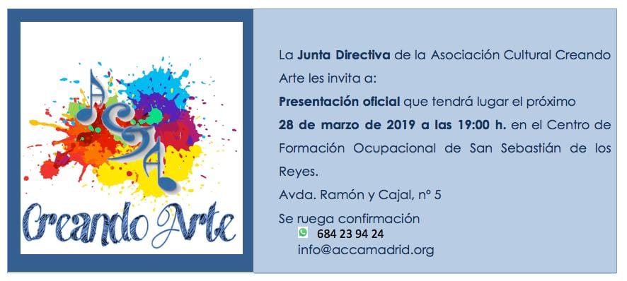 El próximo 28 de marzo tendrá lugar la presentación de la Asociación Cultural Creando Arte (ACCA), cuyo principal impulso es “poner en valor” a las y los artistas locales de San Sebastián de los Reyes y Alcobendas. En esta presentación se contará con un espectáculo de danza, poesía, humor y música, contando con la colaboración como ACUDE, danzArte y APADIS, quienes bailarán “La danza del viento”. Participarán además artistas locales como “El Mago Salao”, el poeta J.C. Krespo, el monologista “Miguel Miguel”, el cantautor “Trujartista", además de baile flamenco y música a cargo de “Tirititrán”.