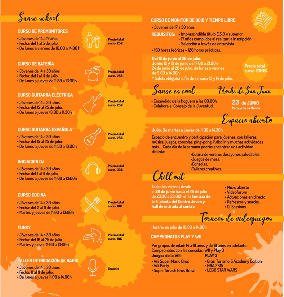 Al margen de estos cursos, también hay disponibles actividades durante junio y julio en el Centro Joven de Sanse. El 23 de junio se llevará a cabo una festividad con hoguera, para celebrar la Noche de San Juan, en el Parque de La Marina.