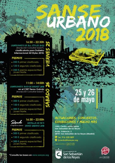 Llega a Sanse una nueva edición del Festival de Cultura Urbana SanseUrbano, en colaboración con la Red Joven Norte, integrada por los municipios de San Sebastián de los Reyes, Alcobendas, Algete, Colmenar Viejo y Tres Cantos. Para participar en cualquiera de los campeonatos de este 'Sanse Urbano 2018', tendrás que inscribirte previamente
