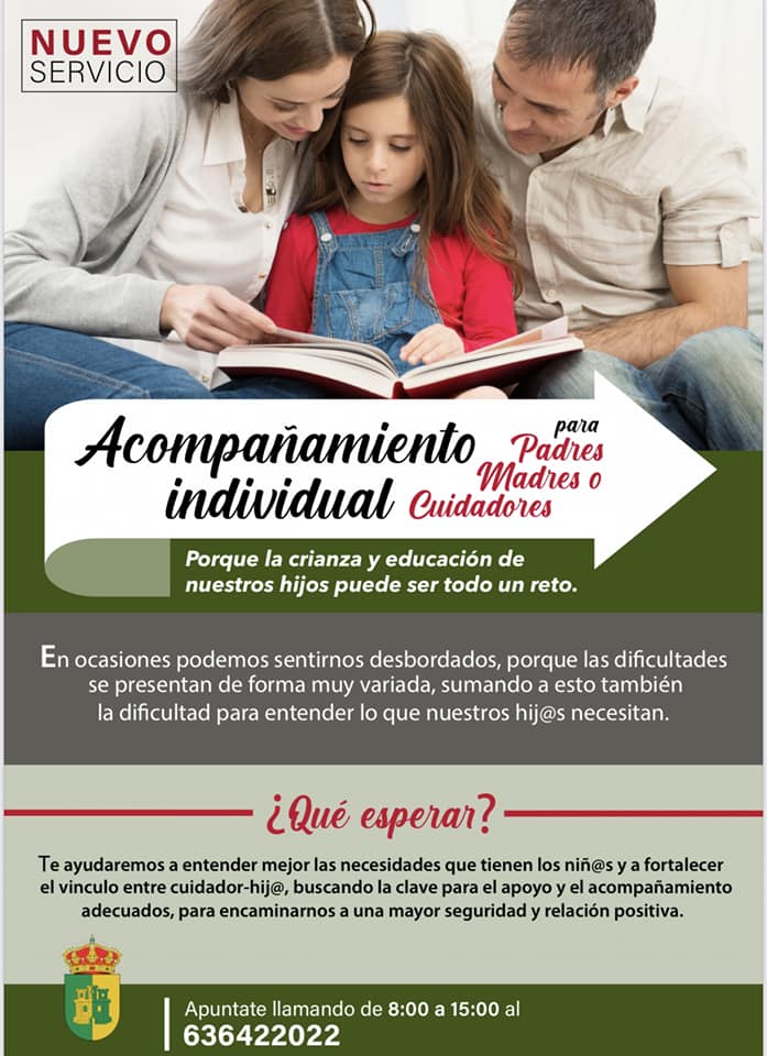 Por último, se pone a disposición de los interesados un nuevo servicio de acompañamiento individual para madres, padres y cuidadores, con la finalidad de ofrecer sesiones personalizadas con las que se pueda revisar qué dificultades experimentan los progenitores con respecto a sus hijos. Estos talleres podrán ser programados directamente por el usuario con el Servicio de Psicología de forma presencial, online o mixta. En esta iniciativa podrán participar empadronados, mayores de edad, trabajadores del Ayuntamiento y usuarios derivados por la psicóloga. Las inscripciones se pueden realizar en el teléfono 636422022, en horario de lunes a viernes, de 8 a 15 horas.