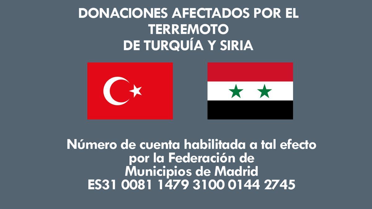 El Ayuntamiento ya ha realizado una primera donación de 10.000 euros para ayudar a los afectados por los terribles daños que está ocasionando el terremoto ocurrido en Turquía y Siria, a la cuenta de emergencia ES31 0081 1479 3100 0144 2745 habilitada a tal efecto por la Federación de Municipios de Madrid.