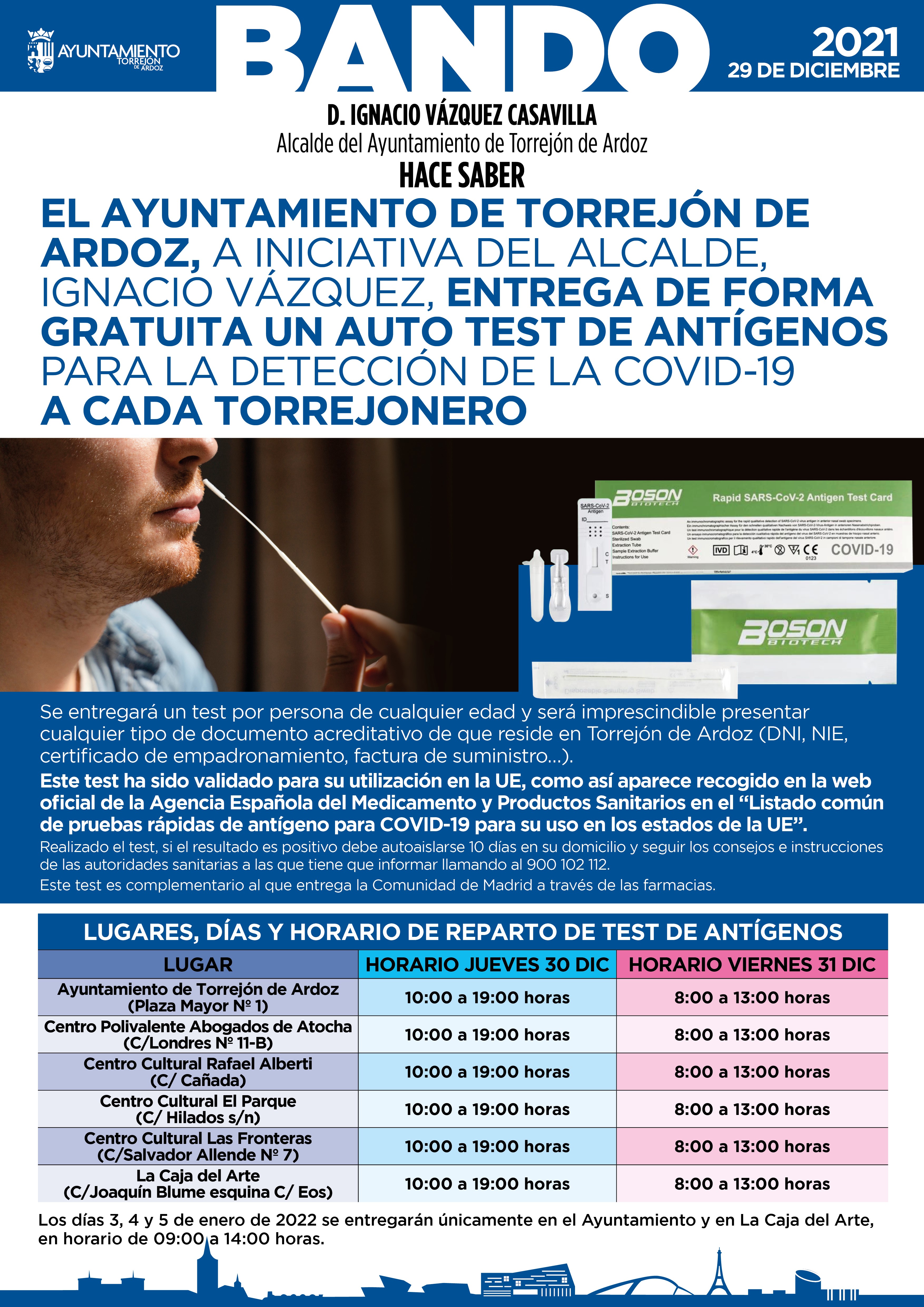 El Ayuntamiento de Torrejón de Ardoz, a iniciativa del alcalde, Ignacio Vázquez, está entregando de forma gratuita, un auto test de antígenos para la detección de la COVID-19 a cada torrejonero. Según el consistorio, nuestra ciudad vuelve a ser una ciudad pionera en la lucha contra esta pandemia al ser la primera que entrega de forma gratuita test para que los propios ciudadanos puedan detectar un posible contagio ante la actual ola de positivos que estamos sufriendo en toda Europa.