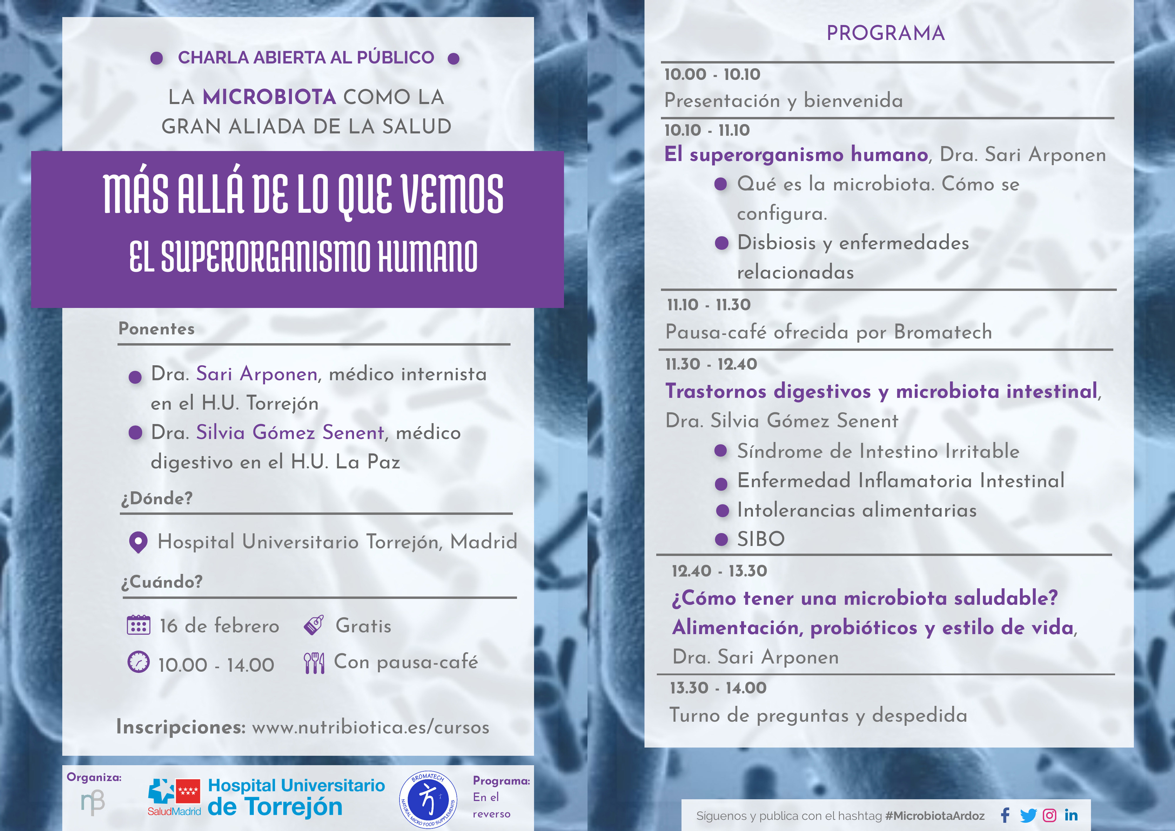 Bajo el título “Más allá de lo que vemos. El superorganismo humano”, se ha desarrollado esta jornada organizada conjuntamente con la empresa distribuidora en España del laboratorio italiano Bromatech (Nutribiótica), el cual es productor de probióticos de cuarta generación. En ella se ha ahondado sobre el papel de la microbiota en nuestra salud, descubriendo las implicaciones que tiene sobre patologías que afectan a las poblaciones occidentales, como son la obesidad, la diabetes, las enfermedades inflamatorias intestinales o las que tienen un origen autoinmune. Las doctoras Sari Arponen, internista en este centro, y Silvia Gómez Senent, responsable de la Unidad de Trastornos Funcionales Digestivos en el Hospital Universitario de La Paz hablaron precisamente de este punto.