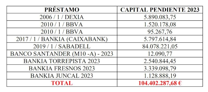 La realidad, según el PSOE, es que la deuda actual del ayuntamiento se cifra en 104.402.287,68 euros, datos que refleja el presupuesto del presente 2023, corroborados por el informe de intervención del ayuntamiento.
