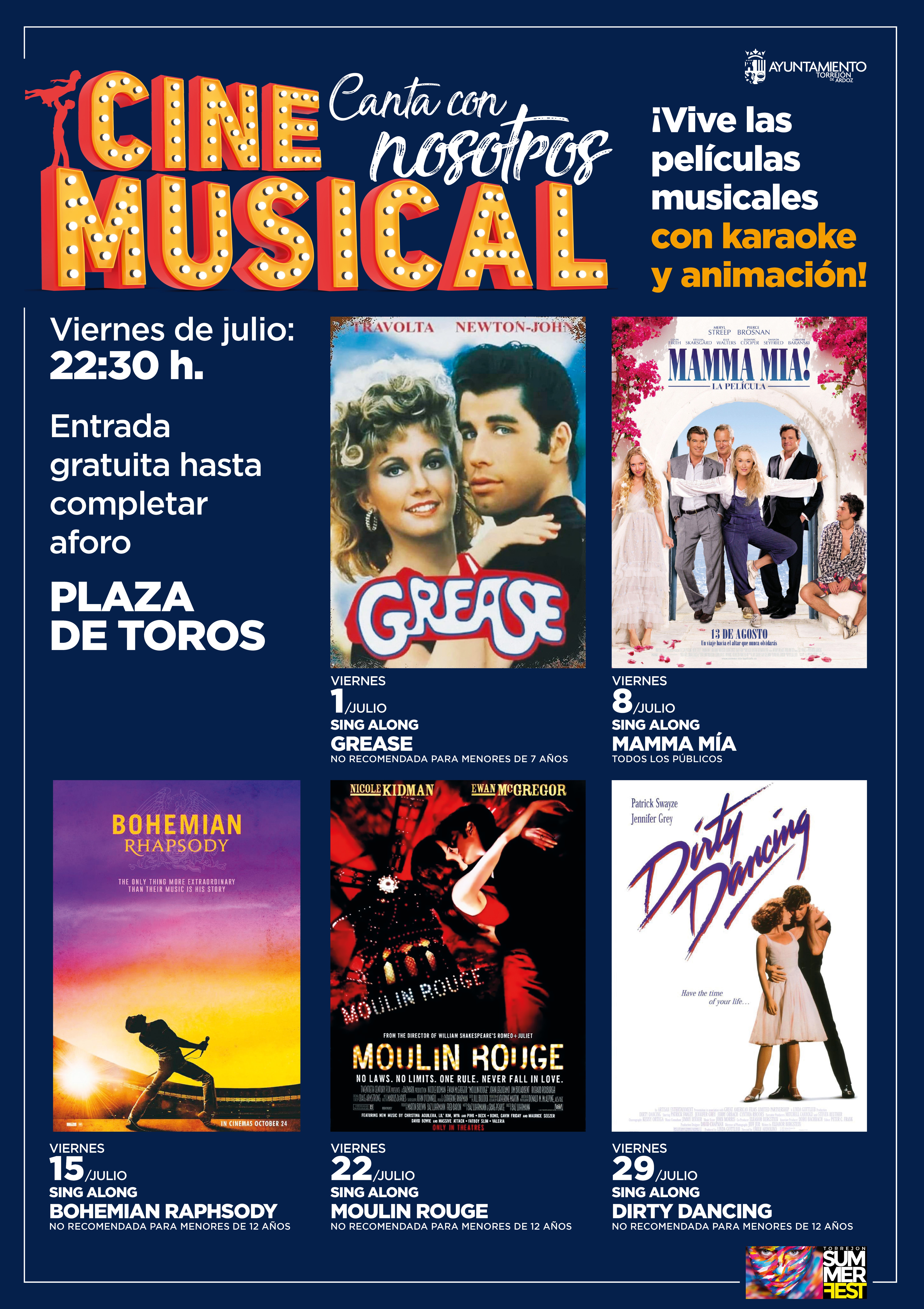 Con la película “Mamma Mia!” este viernes 8 de julio continúa este Cine Musical, Canta con nosotros. El resto de películas que se proyectarán dentro de esta iniciativa serán “Bohemian Rhapsody”, el 15; “Moulin Rouge”, el 22; y por último, “Dirty Dancing”, el viernes 29 de julio. Además, también continúa el tradicional Cine de Verano familiar todos los sábados del mes de julio a las 22:30 horas y los viernes y sábados de agosto y el 2 y 3 de septiembre a las 22:00 horas, en la Plaza de Toros con entrada gratuita hasta completar el aforo.
