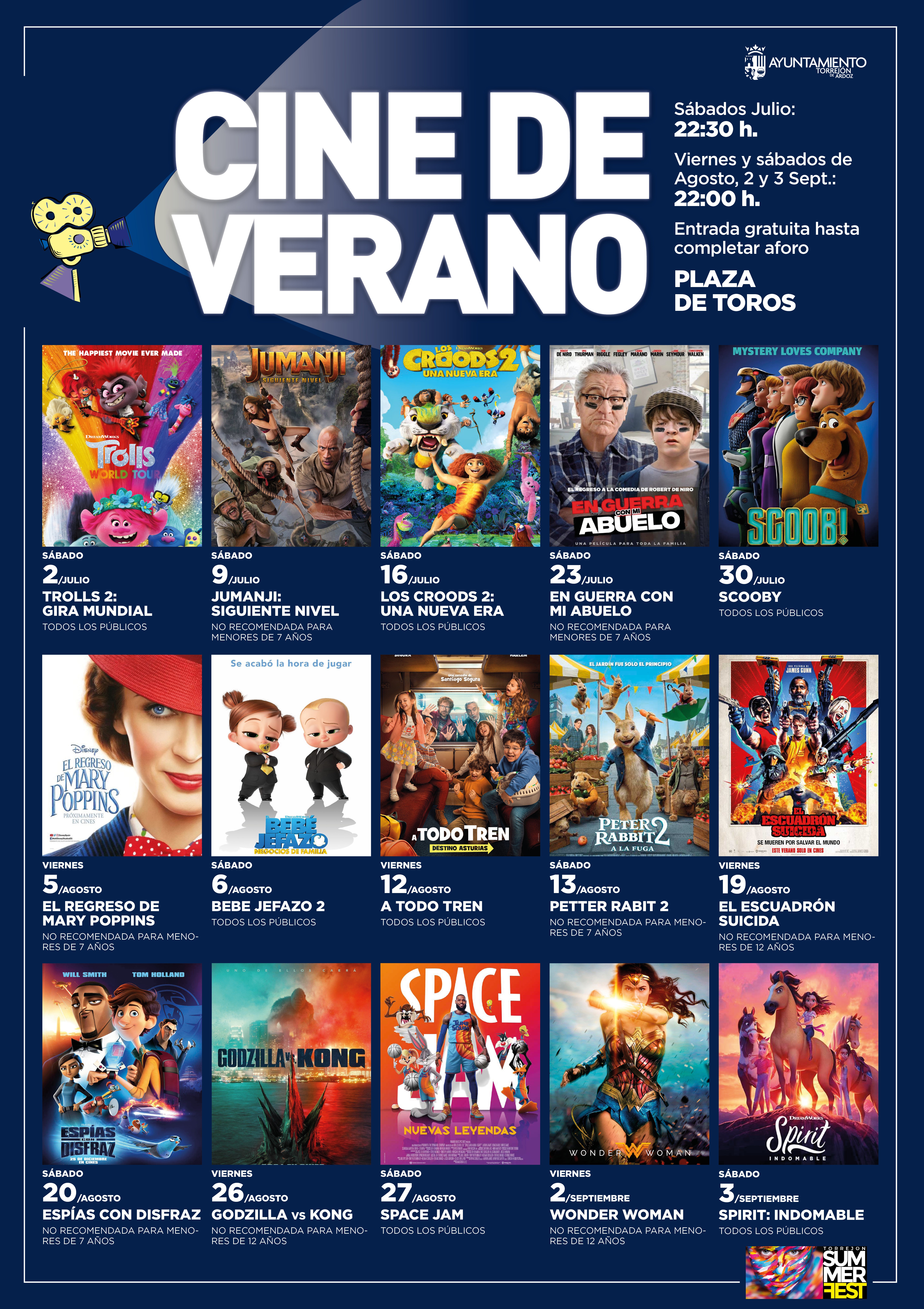 Se podrá disfrutar en familia de películas como “Jumanji: Siguiente nivel” (sábado 9 de julio), “Los croods 2: La nueva era” (sábado 16 de julio), “En guerra con mi abuelo” (sábado 23 de julio), “Scooby” (sábado 30 de julio), “El regreso de Mari Poppins” (viernes 5 de agosto), “Bebé Jefazo 2” (sábado 6 de agosto), “A Todo Tren” (viernes 12 de agosto), “Peter Rabbit 2 (sábado 13 de agosto), “El escuadrón suicida” (viernes 19 de agosto), “Espías con disfraz” (sábado 20 de agosto), “Godzilla vs Kong” (viernes 26 de agosto), “Space Jam” (sábado 27 de agosto), “Wonder Woman” (viernes 2 de septiembre) y “Spirit: indomable” (sábado 3 de septiembre).