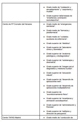 La Comunidad de Madrid ya ha abierto el plazo de solicitud de plaza para las titulaciones de Formación Profesional de cara el próximo curso escolar 2021-2022. En Torrejón de Ardoz, los estudiantes pueden optar a más de 30 modalidades diferentes en seis centros educativos: IES Las Veredillas, IES Isaac Peral, IES Valle-Inclán, IES León Felipe, Centro de Formación Profesional Corredor del Henares y Centro TAFAD Madrid.