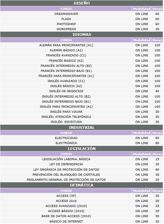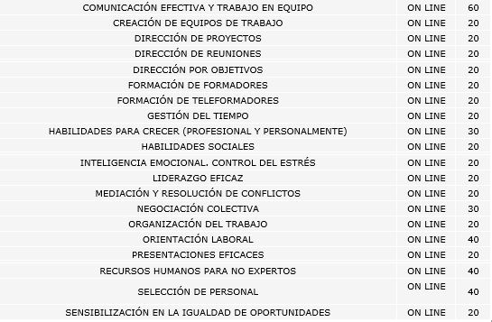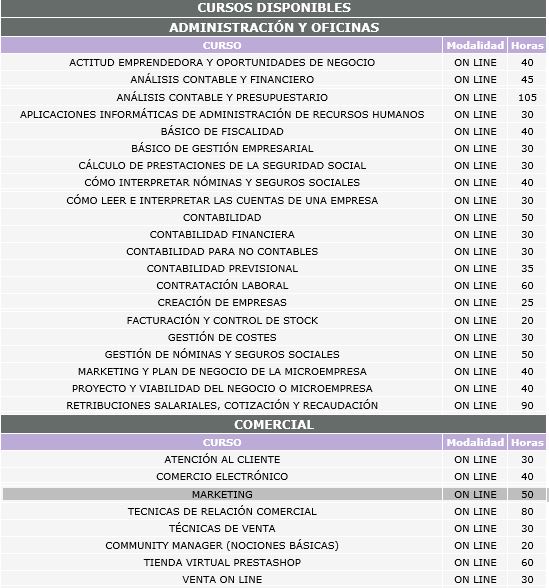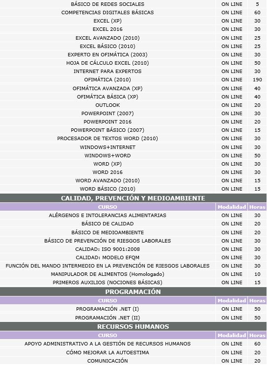 La oferta formativa de esta nueva edición se compone de 119 cursos, incorporando algunos nuevos como “Primeros auxilios”, “Venta online”, “Alemán básico (A2)” o “Community manager”, entre otros. Estos cursos pertenecen a diferentes áreas formativas, como son administración y oficinas, recursos humanos, calidad, prevención y medioambiente, diseño, legislación, industrial, ofimática, programación, idiomas y comercial. En este sentido, antes de realizar la inscripción en la web, el alumnado puede consultar detalles de cada curso, como la finalidad y las unidades didácticas, así como realizar una demo.