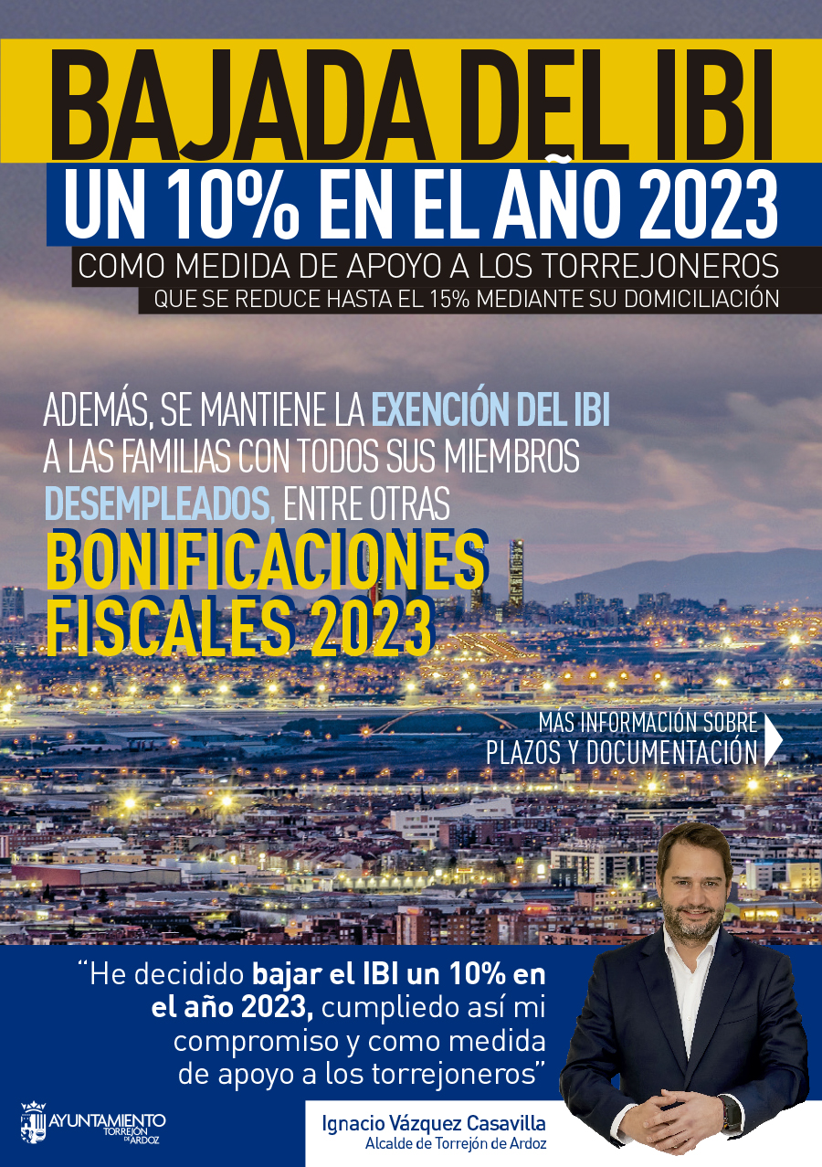 Se mantiene la exención del IBI a las familias con todos sus miembros desempleados, que los torrejoneros que lo deseen paguen éste en dos plazos, la bonificación para familias numerosas hasta el 90%, el fomento de empleo mediante la bonificación del ICIO a las empresas que contraten al menos a 10 torrejoneros y dos nuevas bonificaciones para la instalación de paneles solares y puntos de recarga para vehículos eléctricos. Esta reducción del IBI se lleva a cabo este año y podrá comprobarse en el recibo. No ha podido acometerse anteriormente debido a la situación excepcional económica provocada por la pandemia del Covid.
