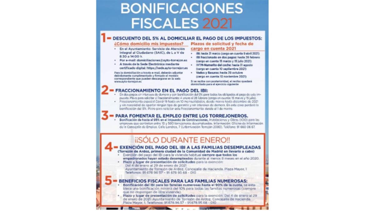 Para 2021 continua la bajada del 5% en los impuestos municipales, a través de su domiciliación bancaria. De esta forma a los torrejoneros que tienen domiciliados sus impuestos y tasas o que lo hagan por primera vez, se les aplicará una bonificación del 5% en éstos en 2021. Además, Torrejón de Ardoz es la segunda ciudad con el IBI más bajo de la Comunidad de Madrid. Algunas de estas medidas forman parte del Pacto Torrejón Solidario acordado por el alcalde y los tres grupos con representación municipal.