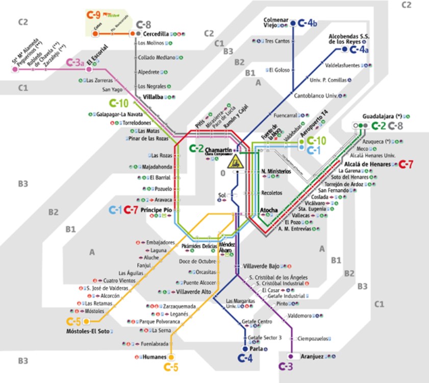 Así, para los usuarios de la línea C4b (Parla-Atocha-Sol-Chamartín-Cantoblanco- Tres Cantos-Colmenar Viejo), si el origen o destino es Nuevos Ministerios y siguientes estaciones, se deberá efectuar un transbordo en Chamartín para utilizar los servicios de las líneas C1, C2, C7 y C10 hasta Nuevos Ministerios y coger los trenes de la línea C4 hasta el destino.