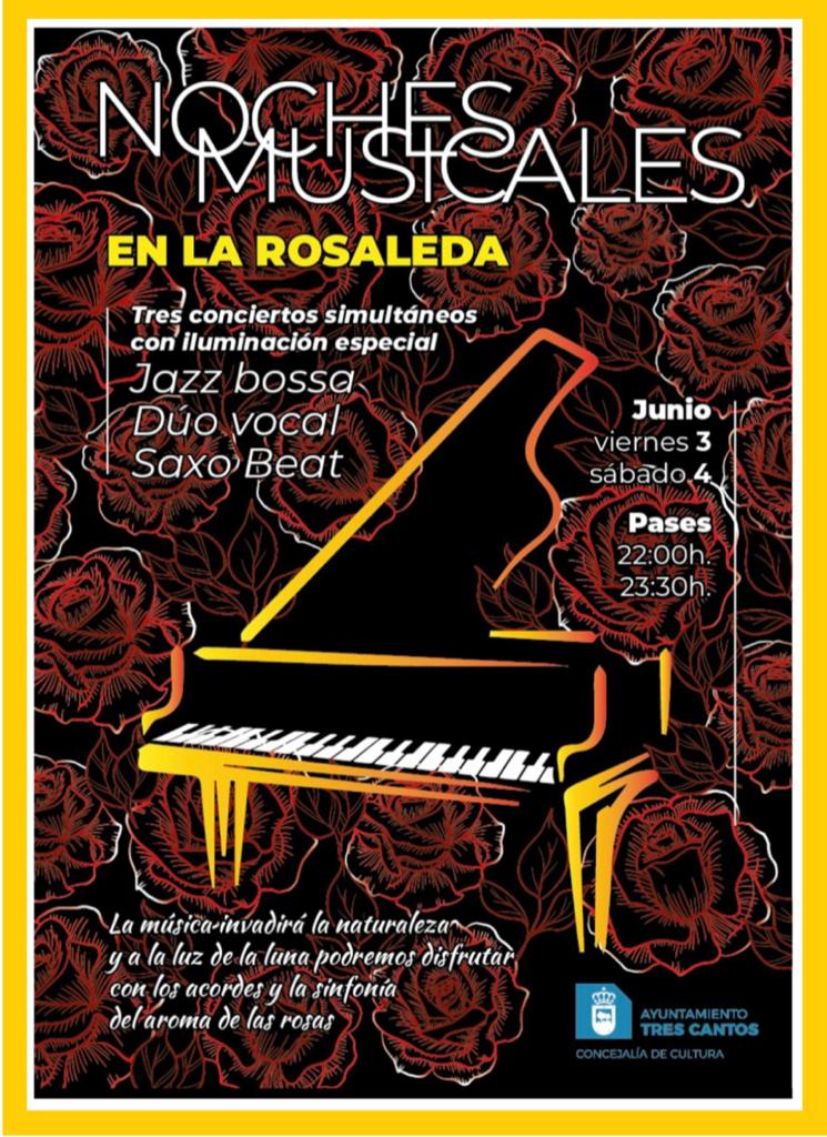La Rosaleda es uno de los espacios más bonitos del Parque Central de Tres Cantos y, especialmente en esta época del año, cuando miles de rosas se encuentran en floración. Por ese motivo, el viernes 3 y el sábado 4 de junio, será el escenario de tres conciertos simultáneos a la luz de la luna. Así, en dos pases, a las 22.00 y a las 23.30 horas, las melodías de un trío instrumental jazz bossa, un dúo vocal y saxo Beat, sonarán entre el aroma de las rosas en este rincón único de nuestra ciudad.