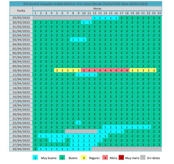 El ICA (Índice de la Calidad del Aire) en la ciudad durante el mes de abril tan solo fueron catalogados como "regular", "malo" y "muy malo" el día 10. El resto de la tabla recoge la calidad "muy buena" y "buena" del aire tricantino.