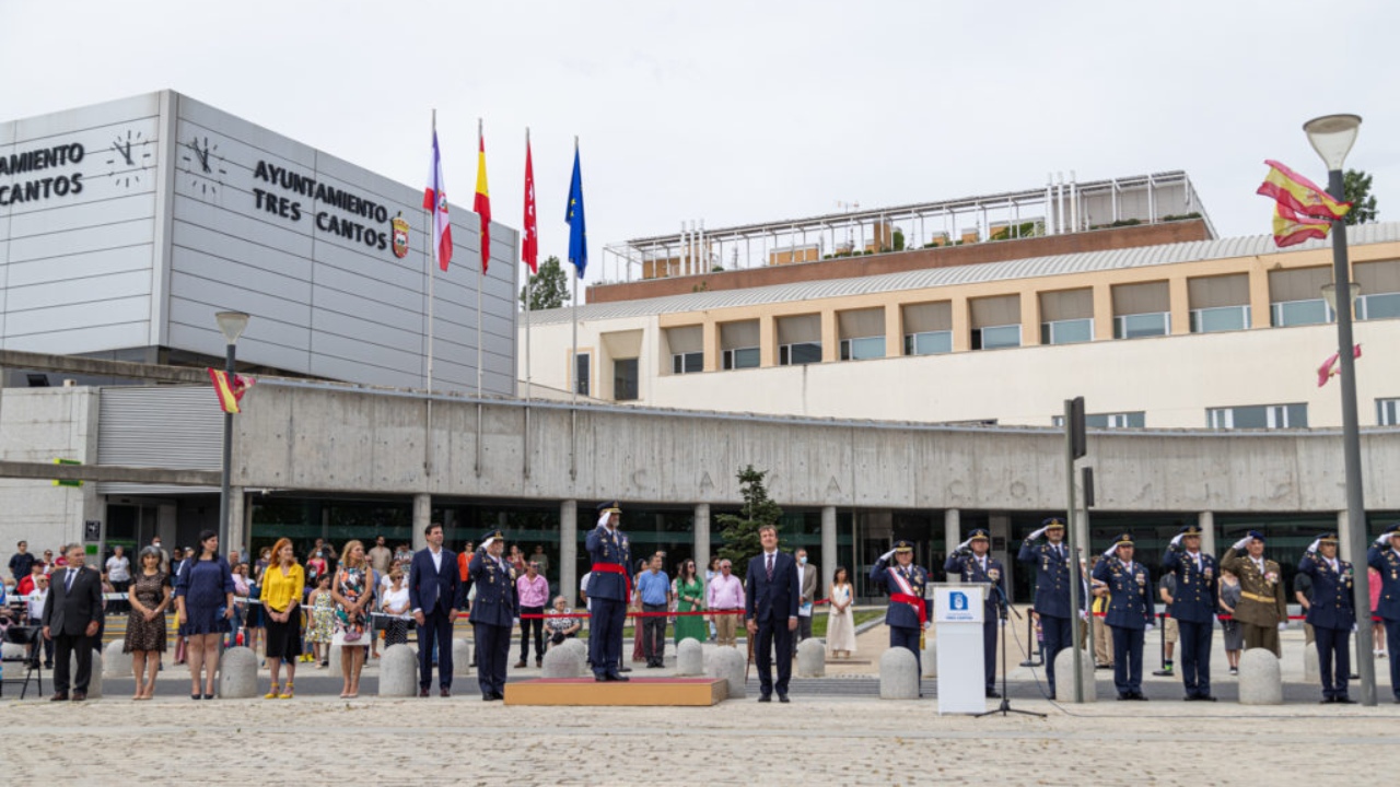 El acto estuvo presidido por el General de Brigada D. Alfonso María Reyes Leis y el alcalde de Tres Cantos, Jesús Moreno García. El Coronel 2º Jefe de la Base Aérea de Torrejón D. Miguel Ángel Barroso Castro, por su parte, tomó juramento a los tricantinos que mostraron su compromiso y respeto con la Bandera, en un solemne acto que tuvo lugar en la Plaza del Ayuntamiento.