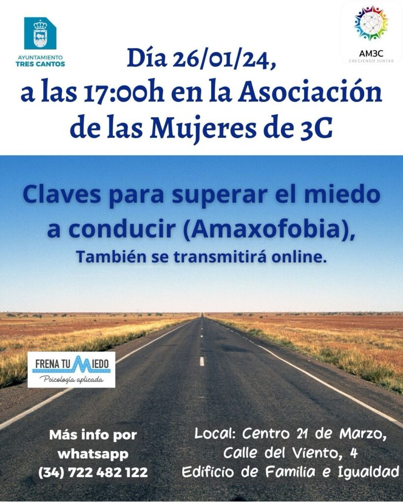 La Asociación de Mujeres de Tres Cantos, en colaboración con el área de Mujer de la Concejalía de Familia e Igualdad, organiza un taller para superar el miedo a conducir.