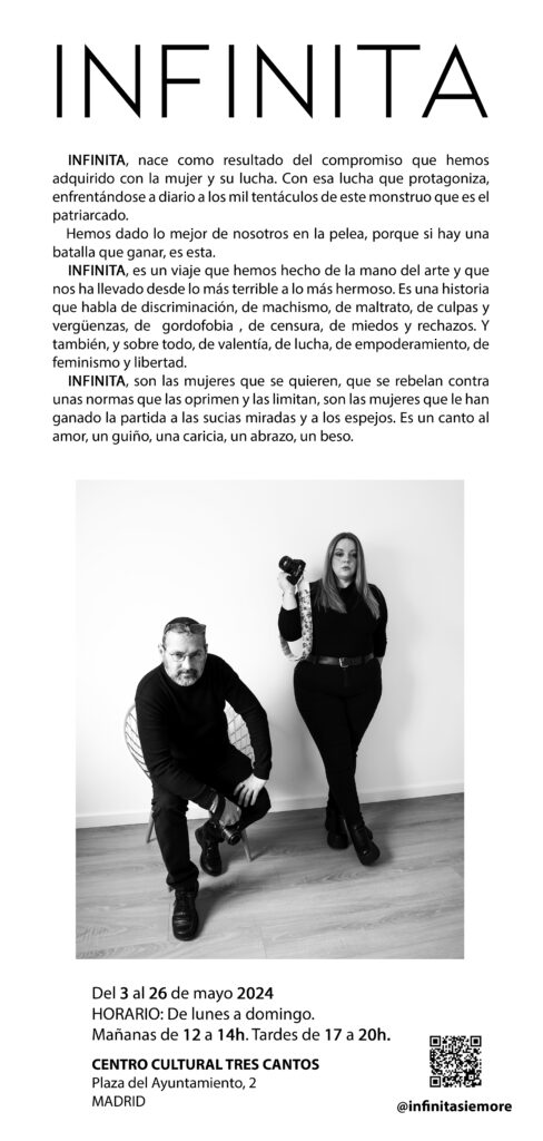 Alice Siempre y Rafa Chevira presentan ‘Infinita’ en la sala Gutiérrez Montiel. Una exposición que nace como resultado del compromiso adquirido por los artistas con la mujer y su lucha. Un viaje hecho de la mano del arte y que los ha llevado desde lo más terrible a lo más hermoso. Una historia que habla de discriminación, de machismo, del maltrato, de culpas… pero también de valentía, de lucha de empoderamiento, de feminismo y libertad.