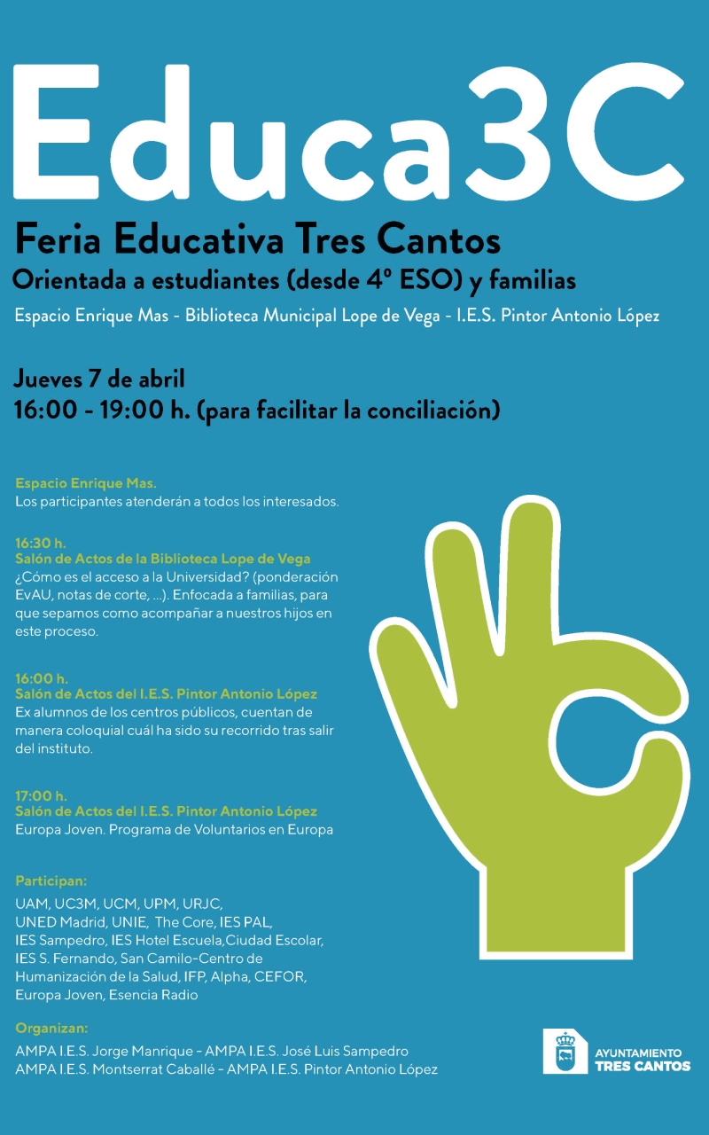 En colaboración con el Ayuntamiento, las AMPAS de los institutos públicos de Tres Cantos han organizado la primera feria Educa 3C, que se celebra a lo largo de la jornada de mañana 7 de abril, entre las 16 y las 19 horas, en el espacio Enrique Mas (Avda. de los Labradores, 26).