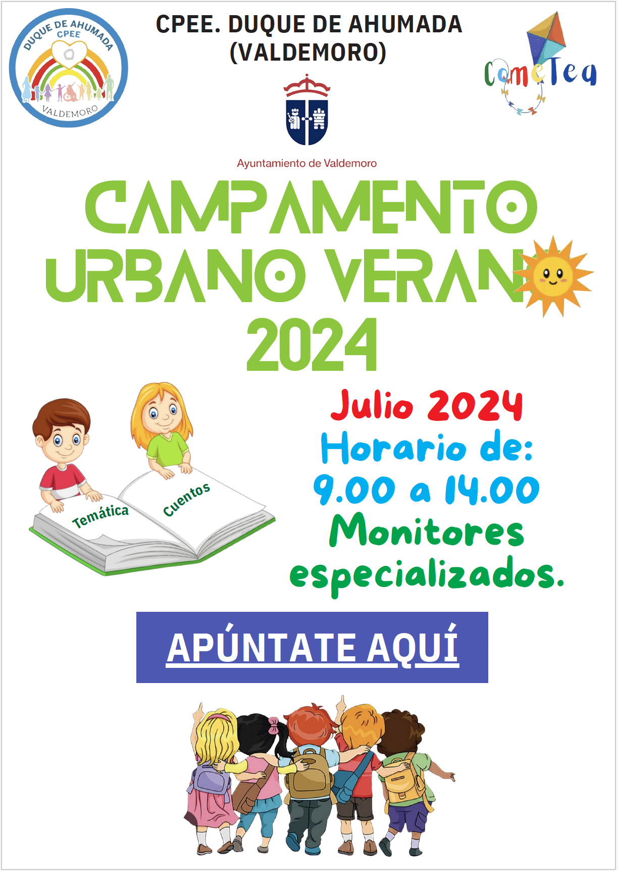 La Asociación de Madres y Padres del Colegio Público de Educación Especial Duque de Ahumada organiza, con la colaboración del Ayuntamiento de Valdemoro, y a través de la asociación ComeTea, un campamento urbano de verano. Este será temático y se llevará a cabo de lunes a viernes, entre el 1 y el 26 de julio, desde las 9.00 a las 14.00 horas, en las instalaciones del centro.