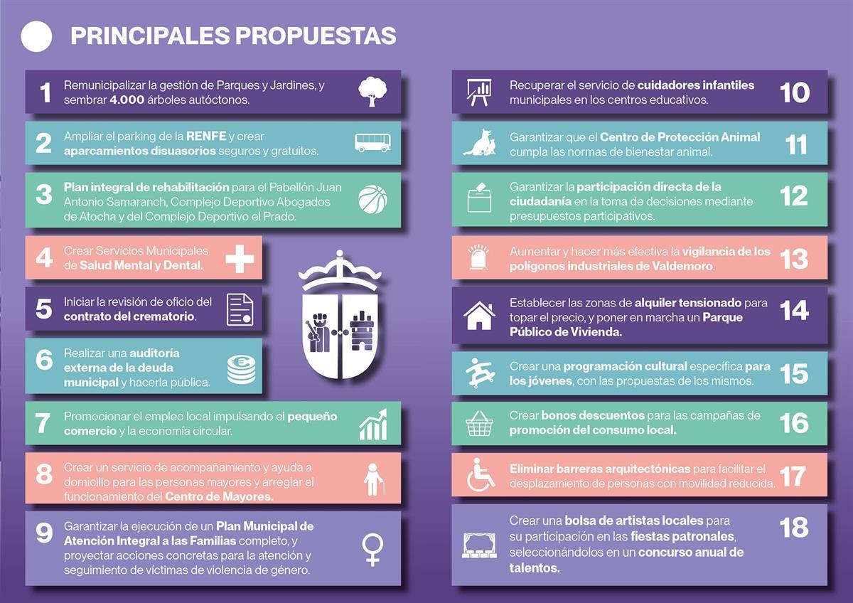 Podemos Valdemoro presenta su programa electoral para las elecciones del 28 de mayo de 2023. En el documento, destacan algunas propuestas en materia de cultura como crear una bolsa de artistas locales para su participación en las fiestas patronales, seleccionándolos en un concurso anual de talentos, y configurar una programación cultural específica para los jóvenes, que incluyan sus propuestas y puntos de vista.