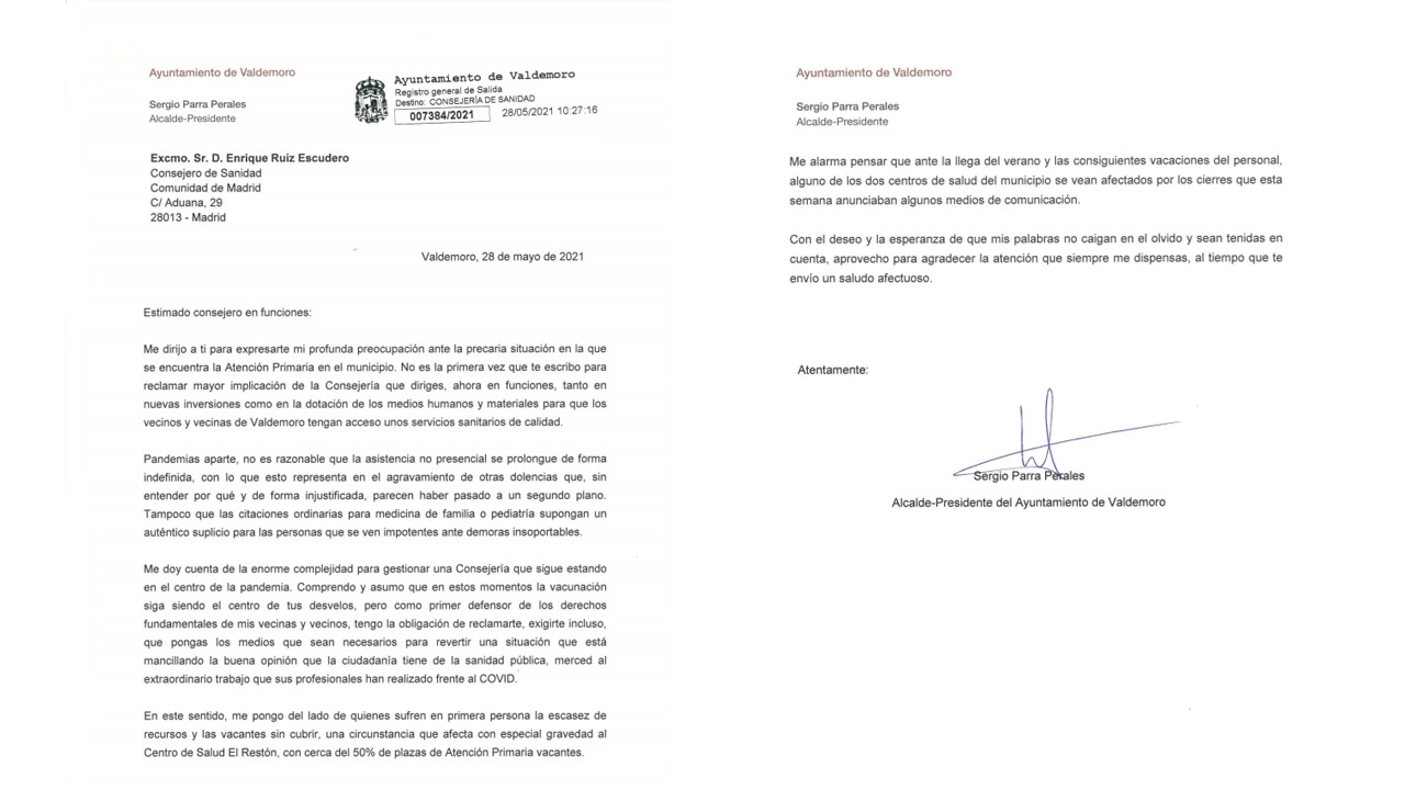 El alcalde de Valdemoro, Sergio Parra, ha remitido una carta al Consejero de Sanidad de la Comunidad de Madrid, Enrique Ruiz Escudero, con el fin de reivindicar actuaciones que reviertan la situación en la que se encuentra la Atención Primaria del municipio. Especialmente en el Centro de Salud de El Restón, que ha tenido que reducir la plantilla a la mitad. El alcalde exige una solución para la "precariedad sanitaria" que sufre tanto la ciudadanía como el personal de los centros.