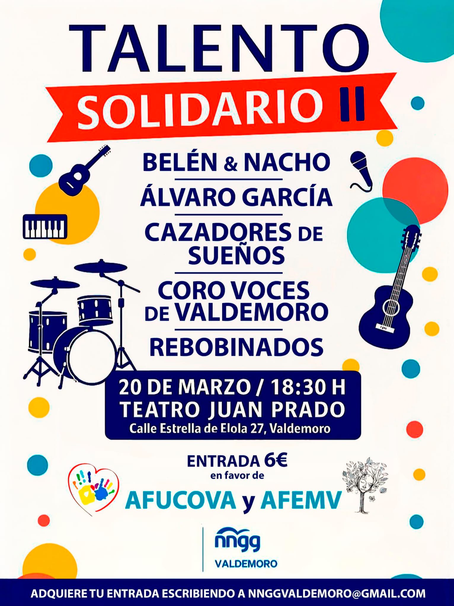 El Teatro Juan Prado acogerá este 20 de marzo la segunda edición de 'Talento solidario', un festival benéfico cuya recaudación se destinará a dos entidades del municipio: AFUCOVA (Asociación de Familiares y Usuarios del Centro Ocupacional de Valdemoro), que trabaja por la inclusión, autonomía y mejora de la calidad de vida de las personas usuarias y sus familias, y AFEMV (Asociación de Salud Mental de Valdemoro), dedicada al apoyo, la integración y cuidados de personas con problemas de salud mental y sus familiares.