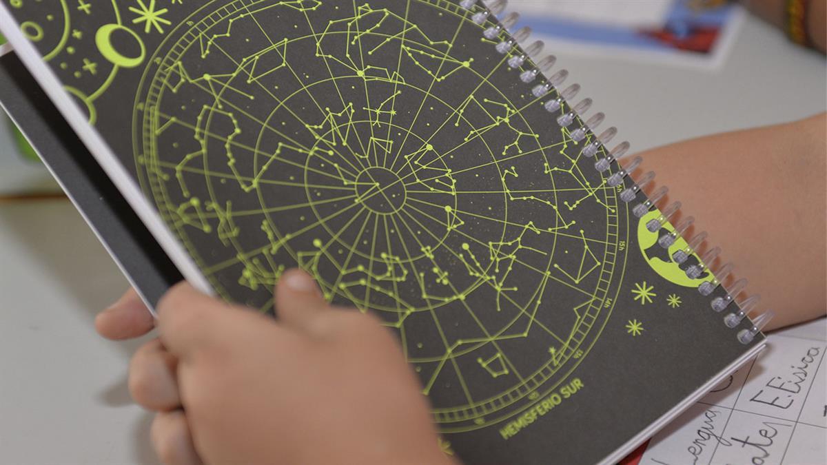 Con el objetivo de generar interés por la astronomía y hacerla más atractiva a los escolares, la portada y contraportada del dietario han sido elaboradas con tinta fotoluminiscente que se carga con luz solar o luz artificial y se ilumina en la oscuridad, revelando las constelaciones de los dos hemisferios que aparecen en ellas.