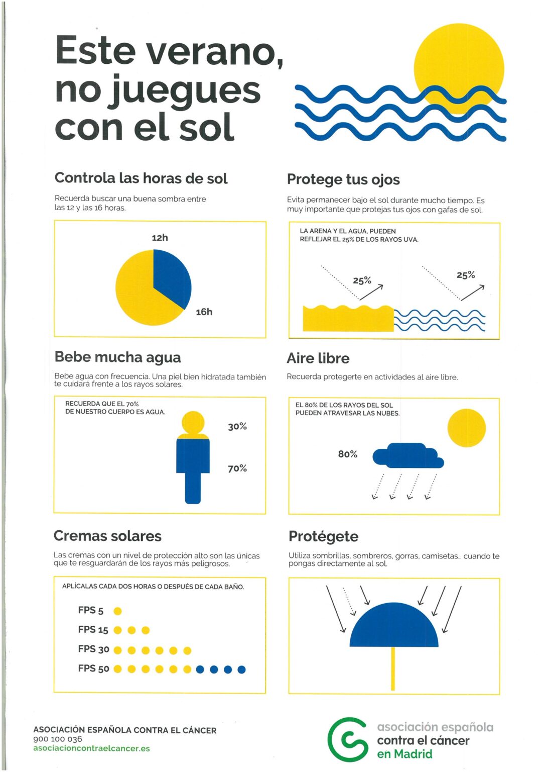 El ayuntamiento recuerda la importancia de controlar las horas del sol, proteger tus ojos, beber mucha agua, darse cremas solares con protección suficiente, utilizar sombrillas o parasoles. Estas son algunas de las recomendaciones que da la Asociación Española Contra el Cáncer para "no jugárnoslas con el sol".
