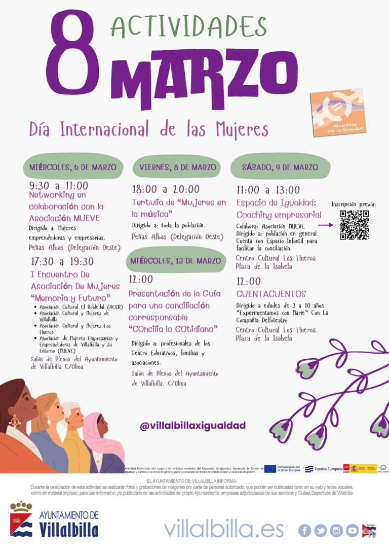 Con motivo del 8 de marzo, Villalbilla ha presentado un programa lleno de actividades algunas dirigidas a toda la población. Disfruta 4 días llenos de encuentros, presentaciones y tertulias entre los días 6,8,9 y 13 de marzo. El miércoles 6 por la mañana habrá una actividad dirigida a mujeres emprendedoras y empresarias para que puedan hacer "Networking", es decir, una reunión donde las mujeres podrán formar relaciones empresariales, crear y desarrollar oportunidades de negocio.